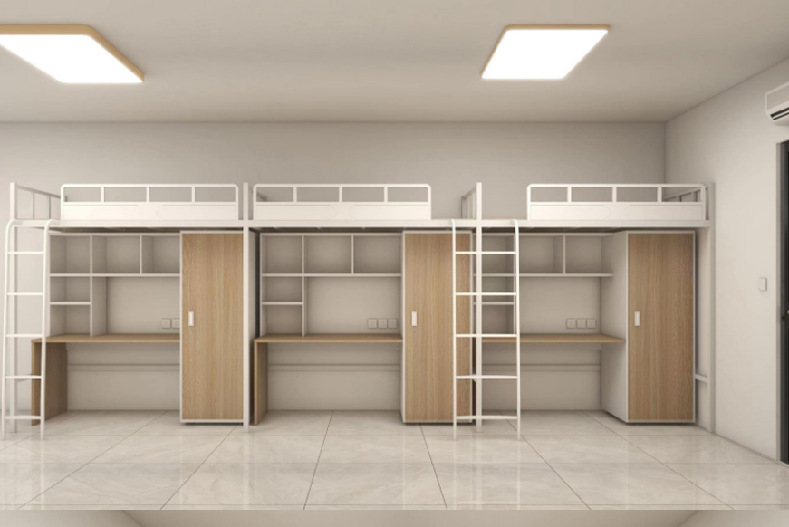 三聯(lián)體公寓床則更適合六人間宿舍,?其設計特點在于服務人數(shù)較多,?空間利用率更大。?三聯(lián)體公寓床通常采用側(cè)梯設計,?以適應更多人的住宿需求,?同時保持空間的整潔和美觀。?這種設計在員工宿舍中較為常見,?能夠有效地利用有限的空間,?提供更多的住宿選項。?
