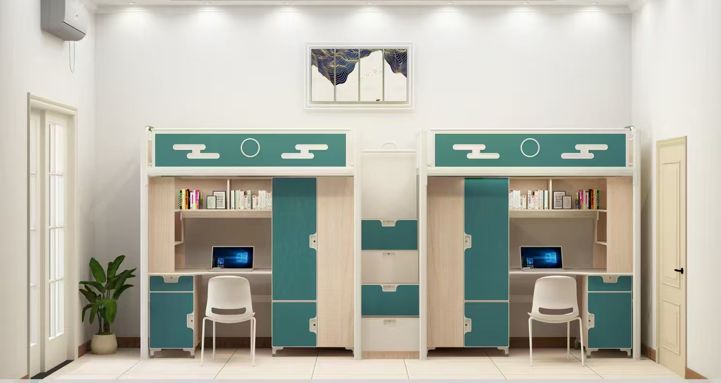 再者,上床下桌是解決合宿人數多的宿舍高效分配空間的**選擇。一般來說,一間宿舍會安排2-4個學生共同居住,這時候每個人都需要有一個自己的空間用來存放書本和文具等,上床下桌設計可以滿足個人個性化需求,讓不同個性的學生都能夠在房間內找到適合自己學習和生活的小角落。