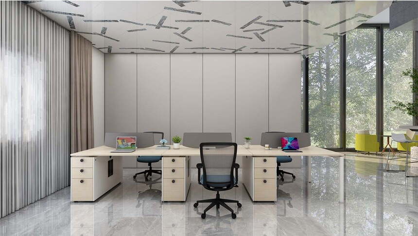 開(kāi)放式辦公區(qū)配置屏風(fēng)卡位+活動(dòng)柜+網(wǎng)背辦公椅,有效兼顧私密性與協(xié)作性,適合中小型企業(yè)團(tuán)隊(duì)辦公使用。